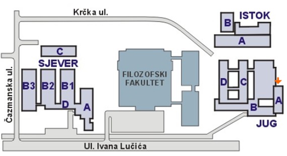 Parkirati je moguće na fakultetskom parkingu južne i istočne zgrade (označeno crvenom elipsom) prilazom iz Krčke ulice. Ako rampa nije otvorena, potrebno je pozvoniti i reći da se ide na sudački seminar i dodati moje ime: Marino Grozdek.